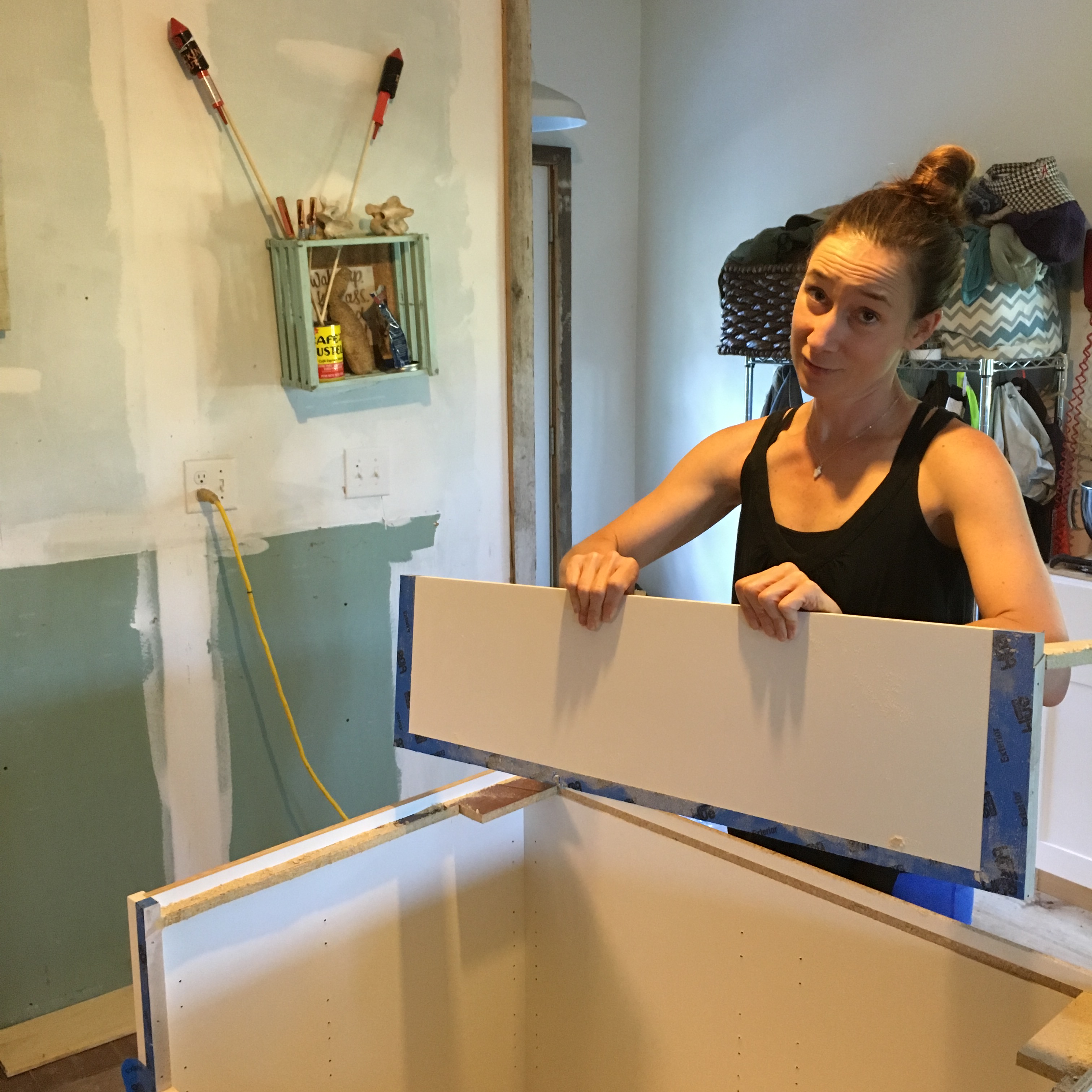 When we moved in two+ years ago, we totally reworked and moved the kitchen to another wall. We took down the uppers (some of them are now in the mantainer for storage), moved the lowers to the new kitchen wall, hacked up the L-shaped countertop to make it work on our new configuration, and held our breath in hopes that they would last until we could get new ones.