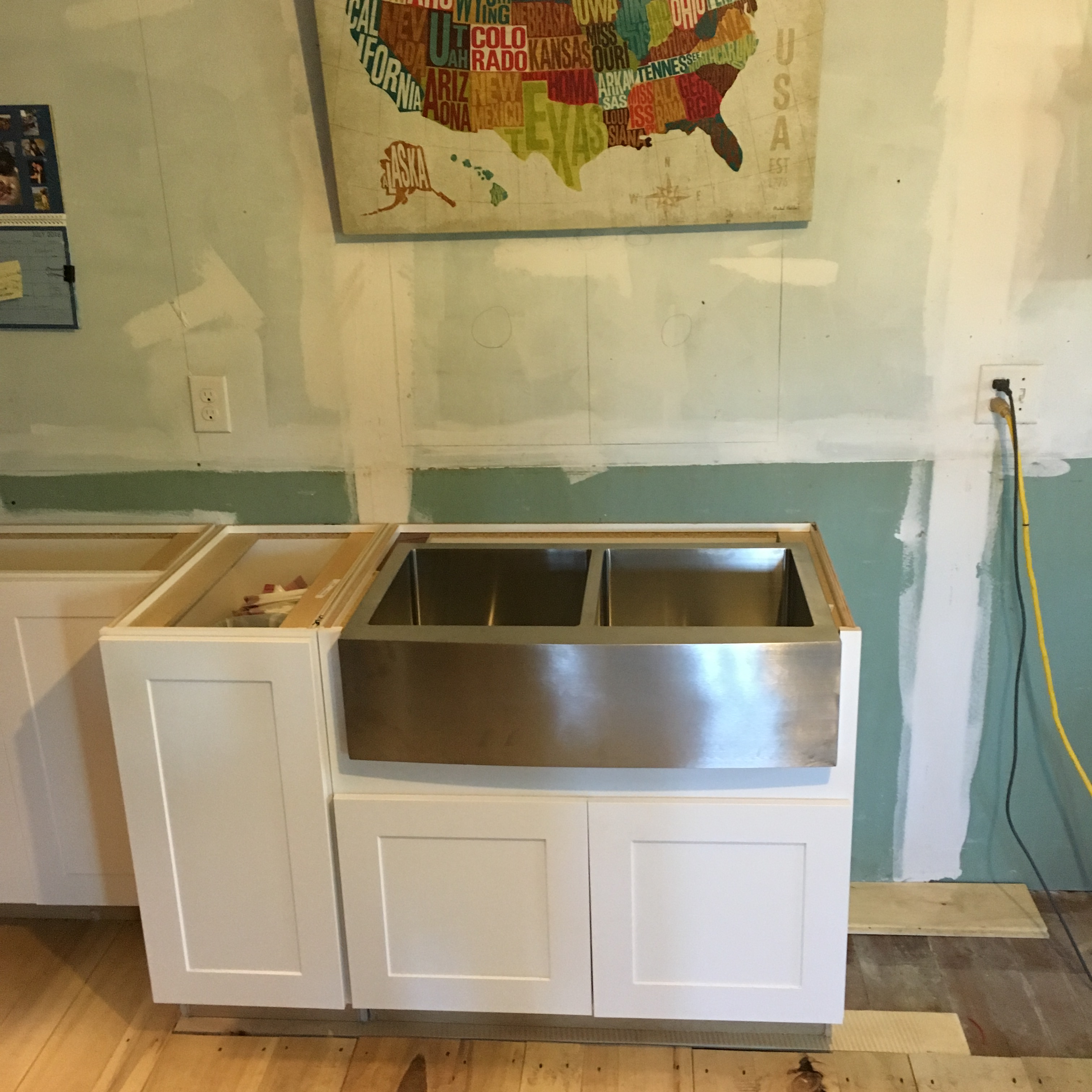 Our sink is a stainless apron front version. Suffice it to say the installation directions that come with the sink are not the most helpful. Luckily, we were at the beginning of month’s wi-fi allowance (yay for satellite wi-fi!) and Ben was able to watch a few YouTube videos on the subject.