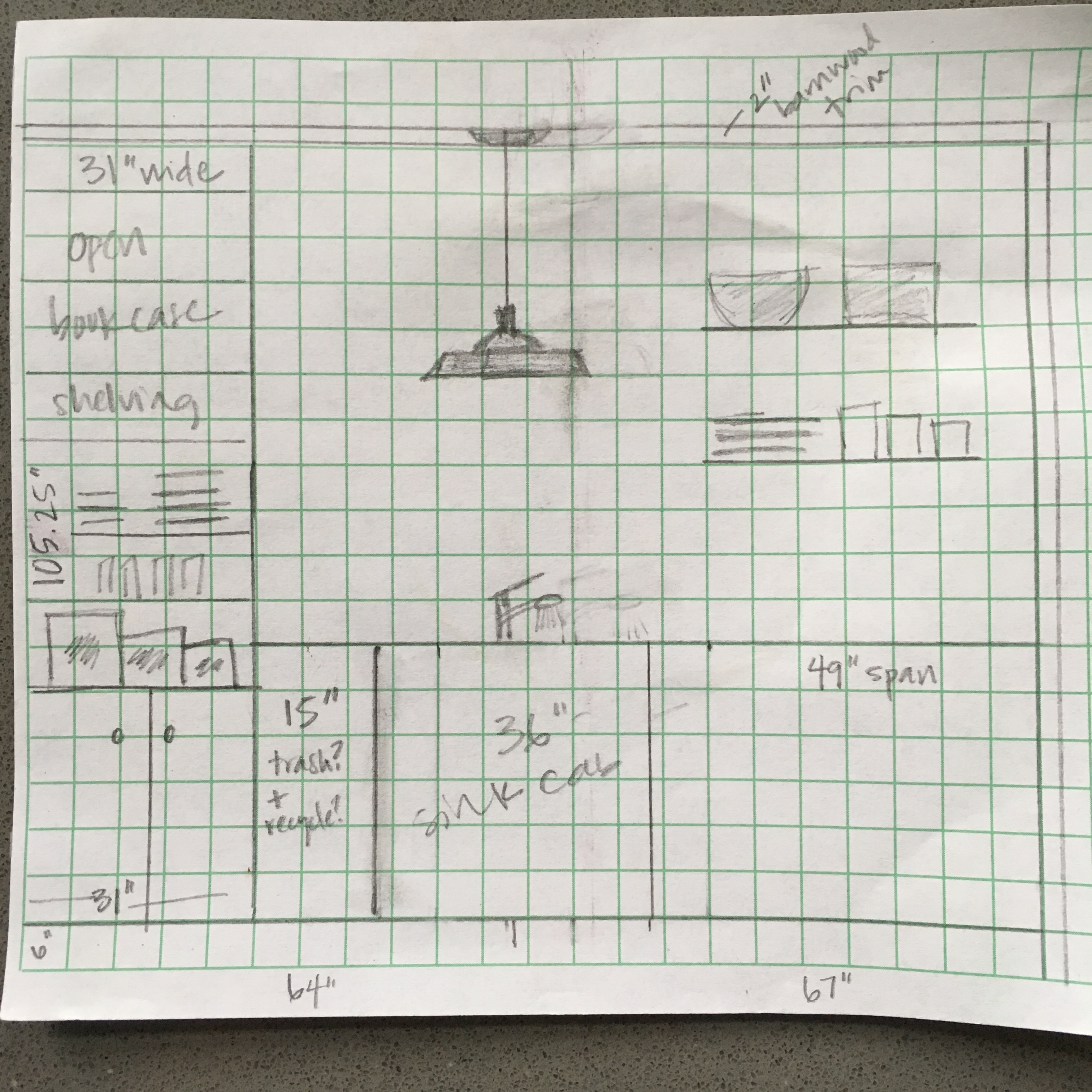 For this space, I designed a cabinet specifically to hold the large tote where we keep dog food. The tote sits on a slide-out drawer bottom so that we can open the cabinet doors and slide the drawer out without lifting the 50lbs or so of dog food. Genius! Until, of course, we decide the dog food lives somewhere else. But I’m sure I’ll come up with some other fabulous use for that amazing cabinet!  Wait…I’m getting ahead of myself.