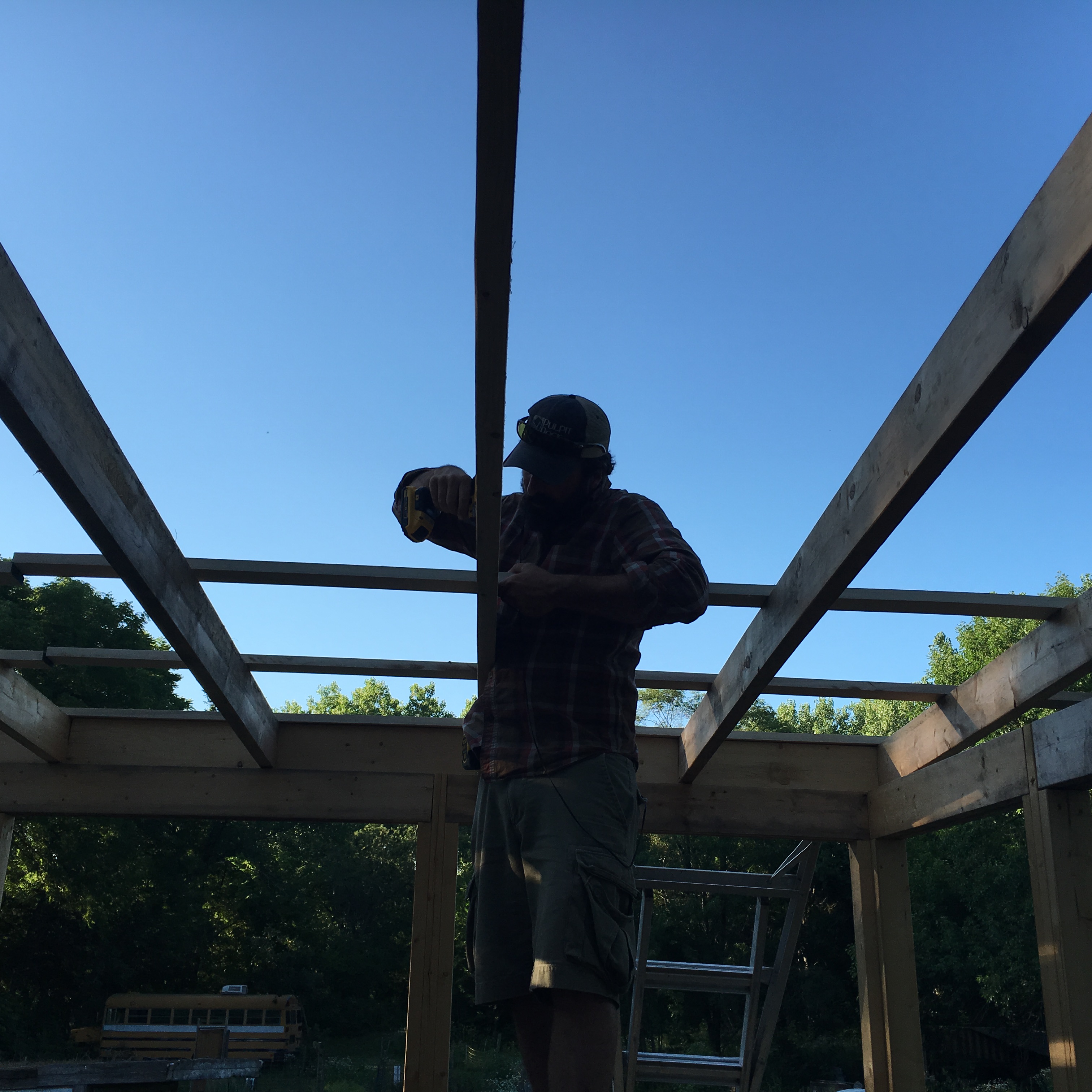 Note the temporary roof…it’s a tarp Ben put in place to give us at least a little cover from the summer rain.