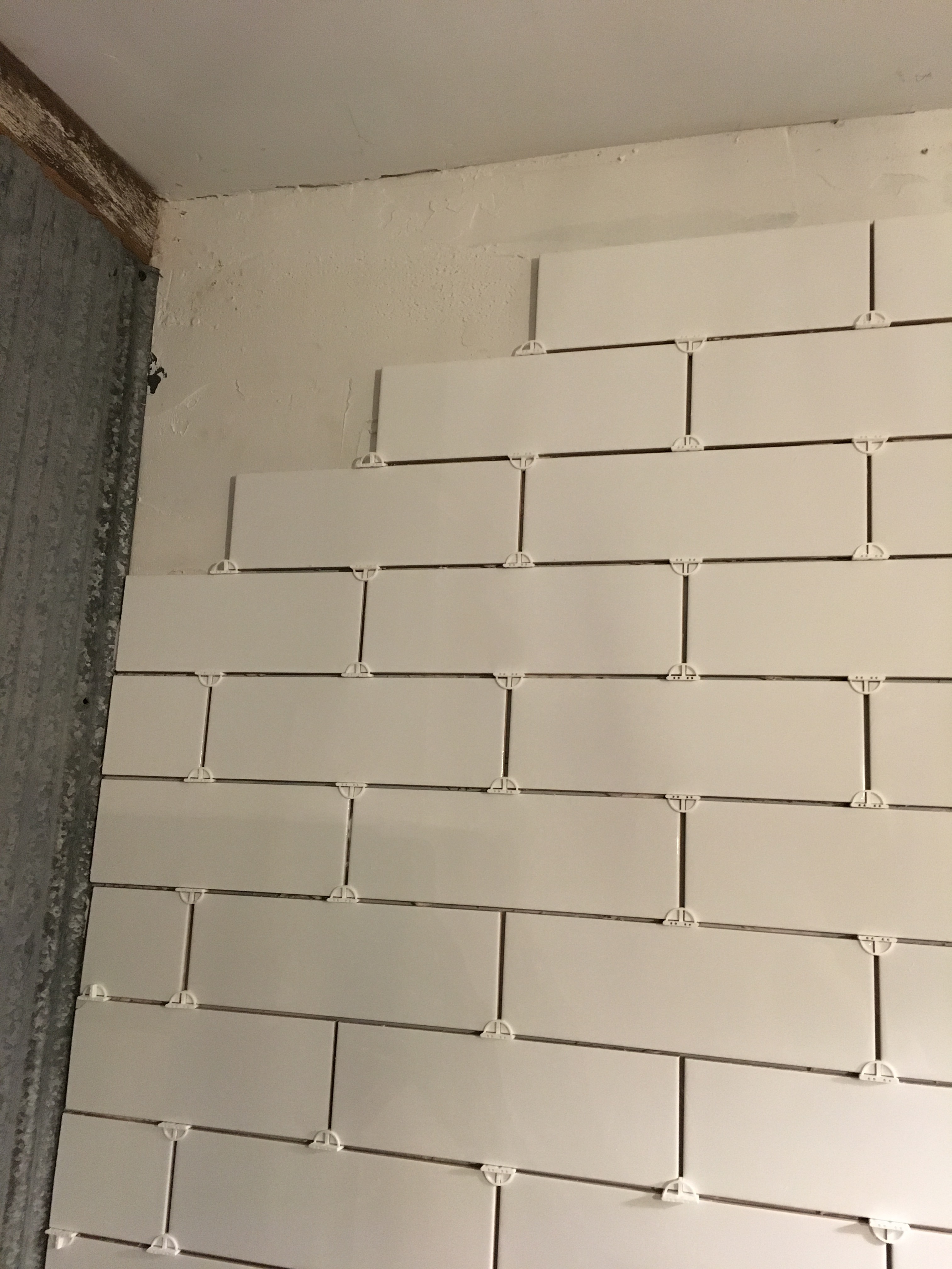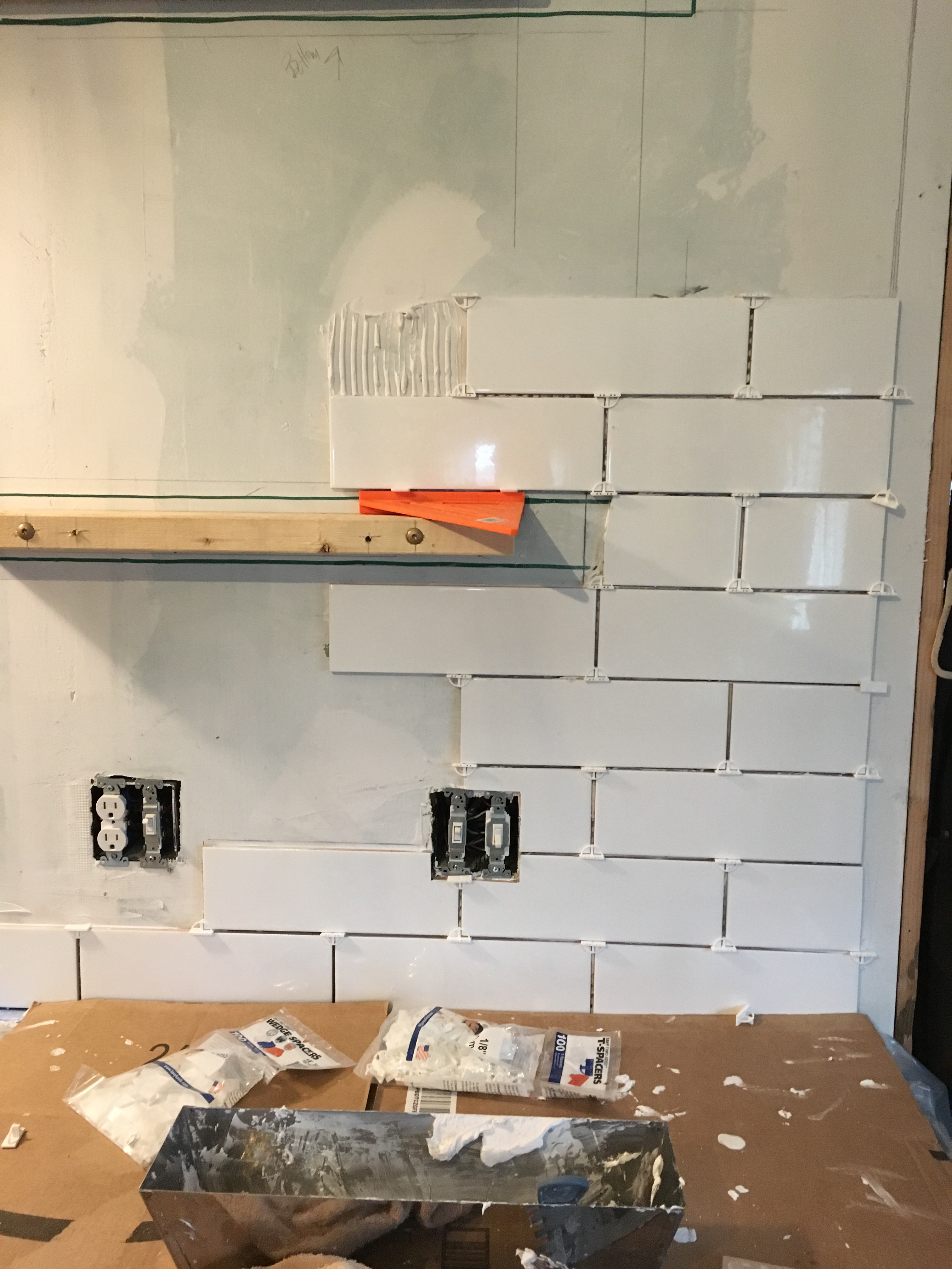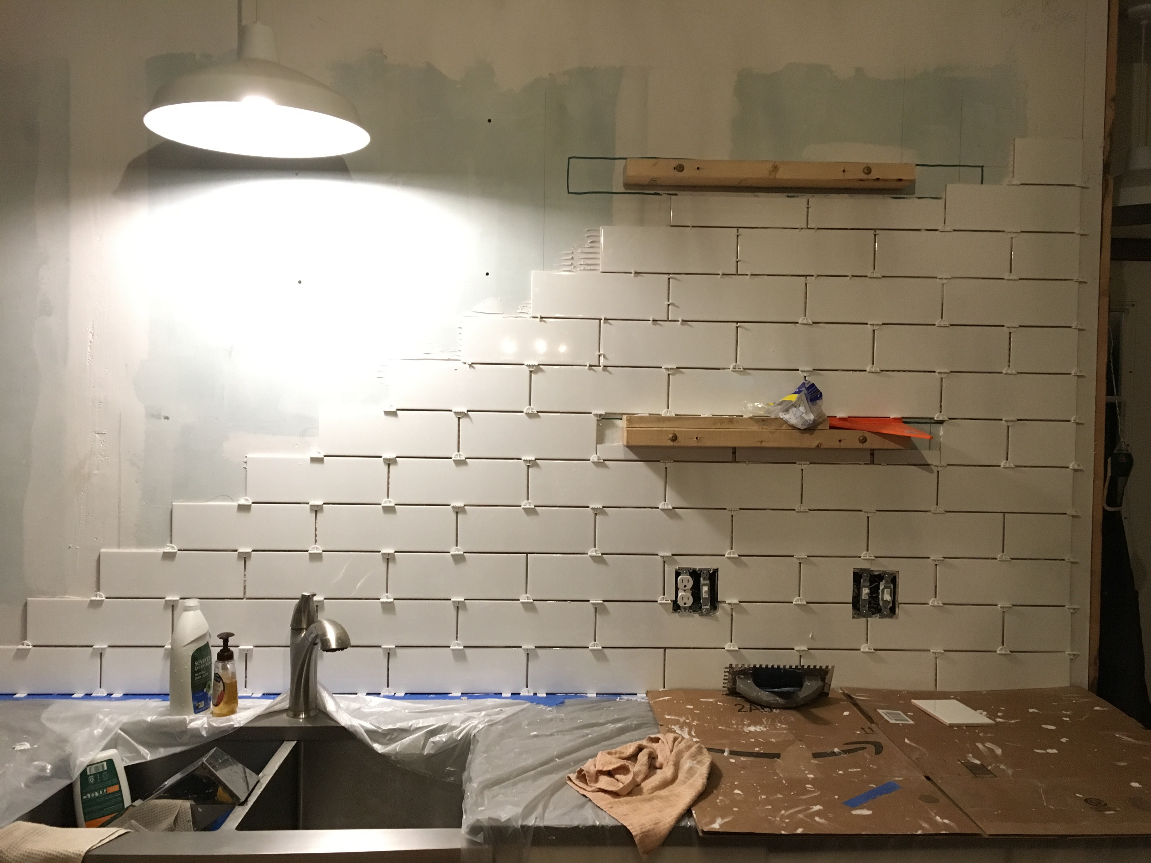 Well, not totally done. I’m counting it as a success because all those tiles stayed stuck to the wall and (except for one…because of those stupid X spacers) they are in straight lines and at right-angles to each other and (for the most part) perfectly placed. The installation took much longer than I expected, so I decided to wait on the grout until Ben was back at home.