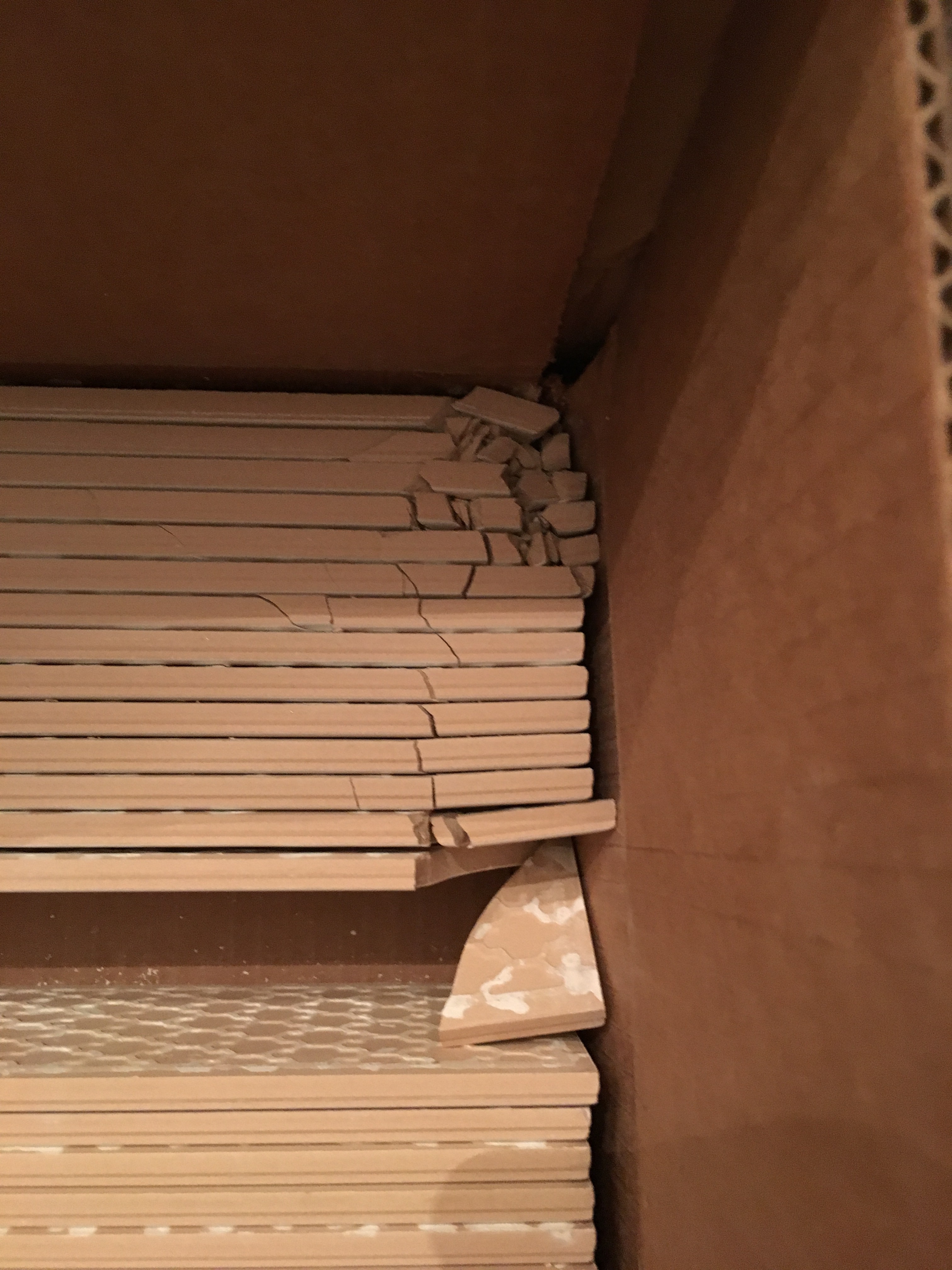 The tile arrived and is gorgeous!!  And broken. Ugh. But I love it!! It was packed amazingly well…I’m talking three boxes packed inside each other like Russian nesting dolls, each one wrapped in layers of bubble wrap on all sides. But somehow, there are cracked and broken tiles in three of the five shipments (that’s a total of 15 boxes to ship 5 boxes of tile. crazy.). I hope I have enough whole ones to make this wall happen!!