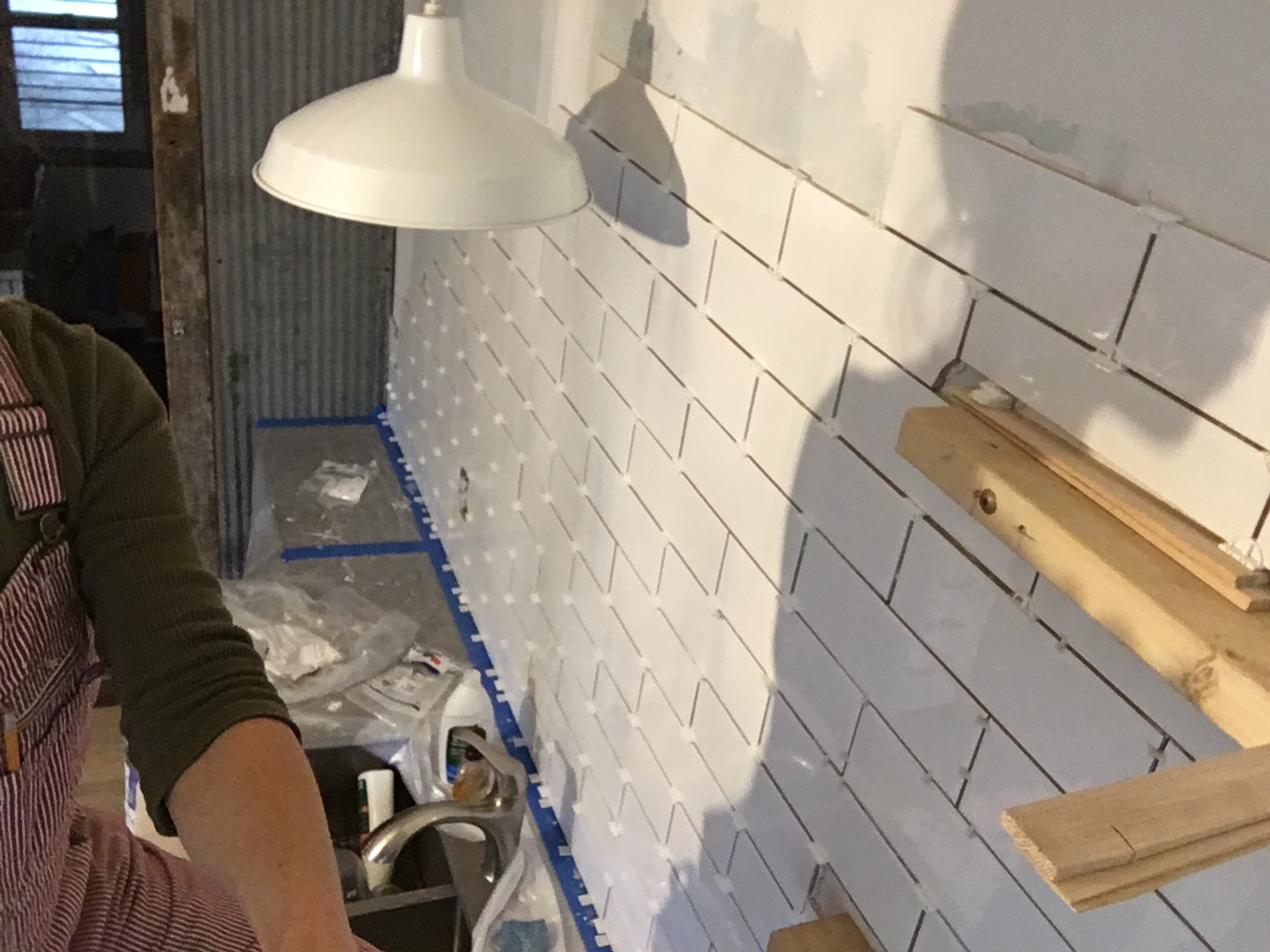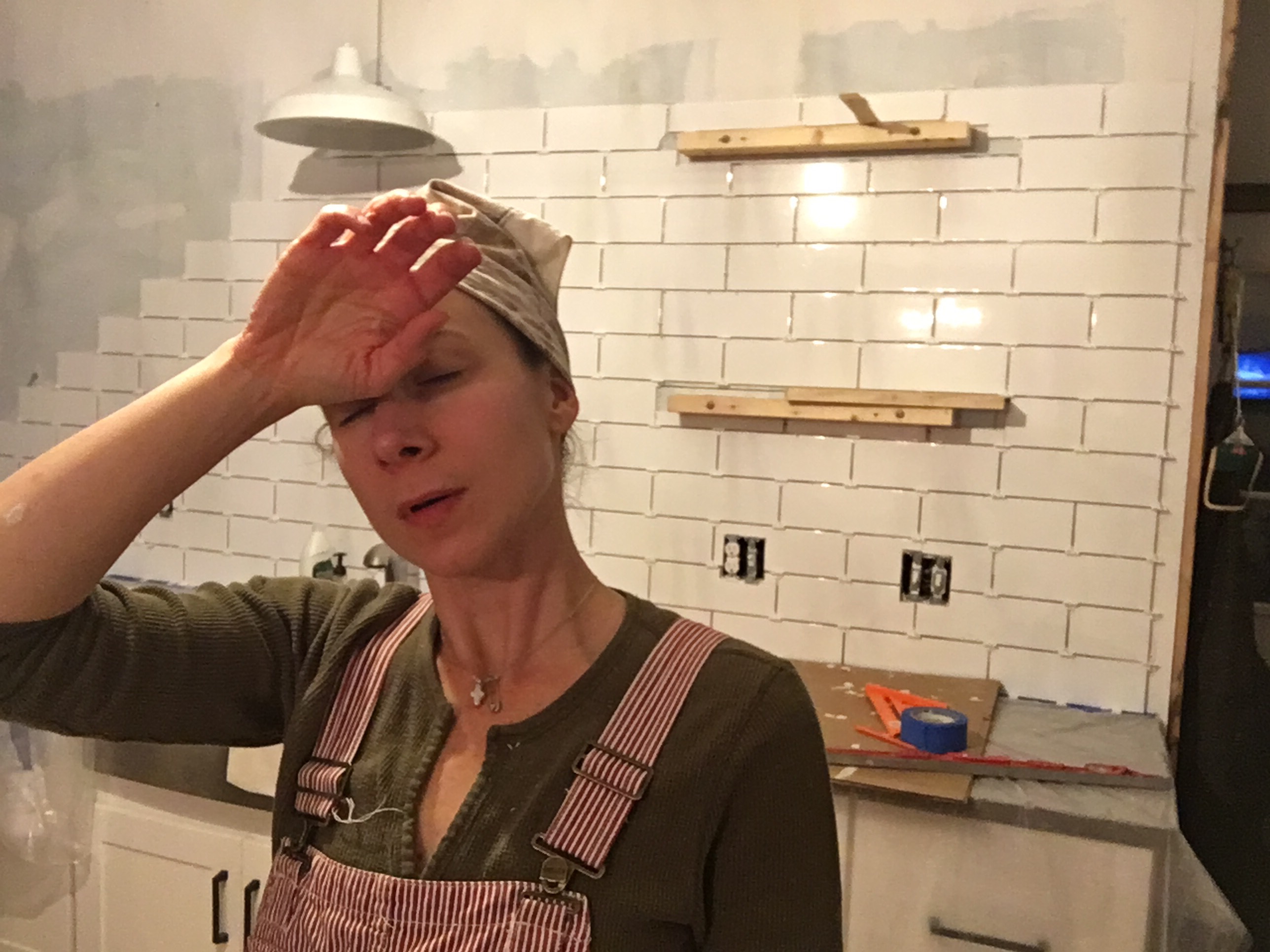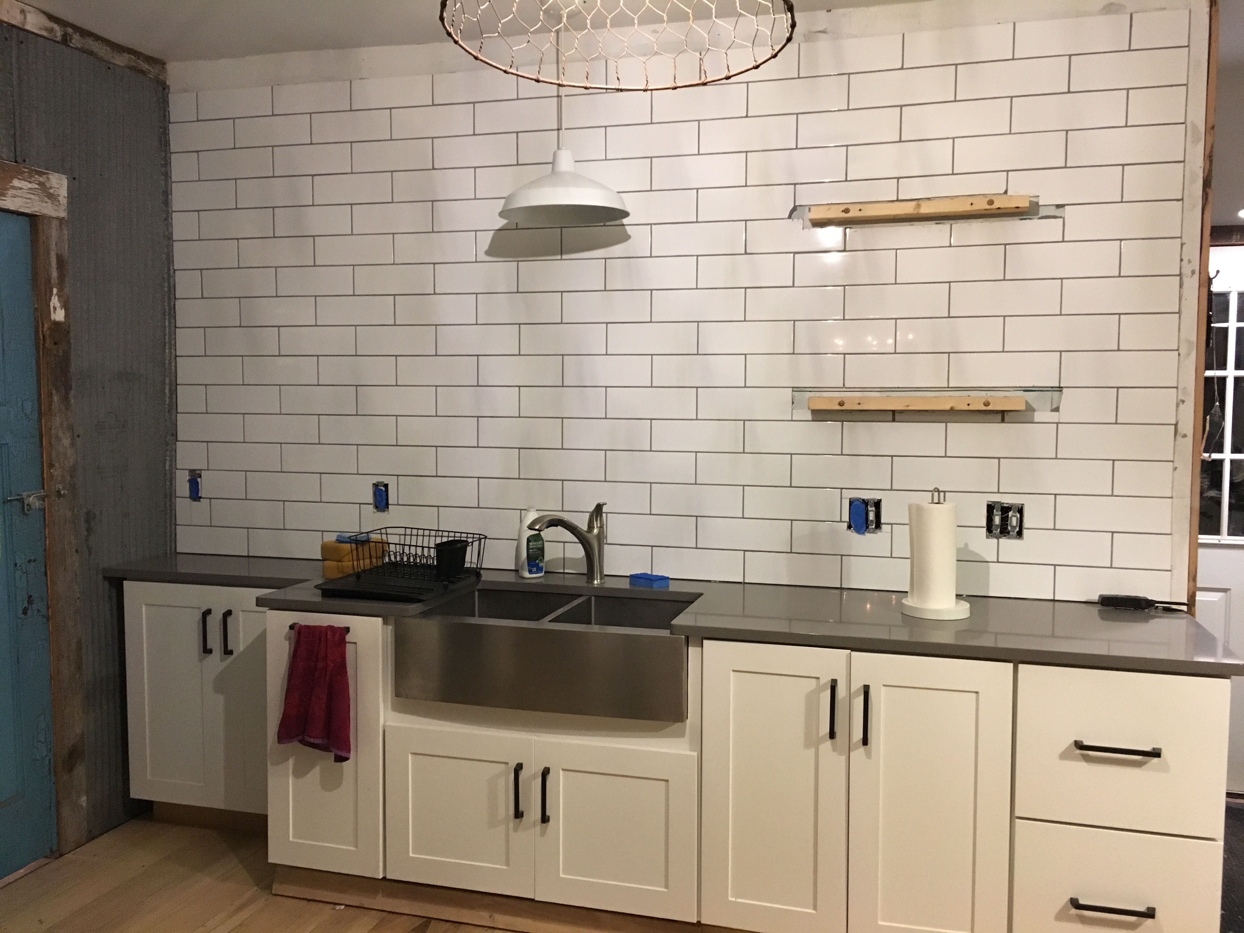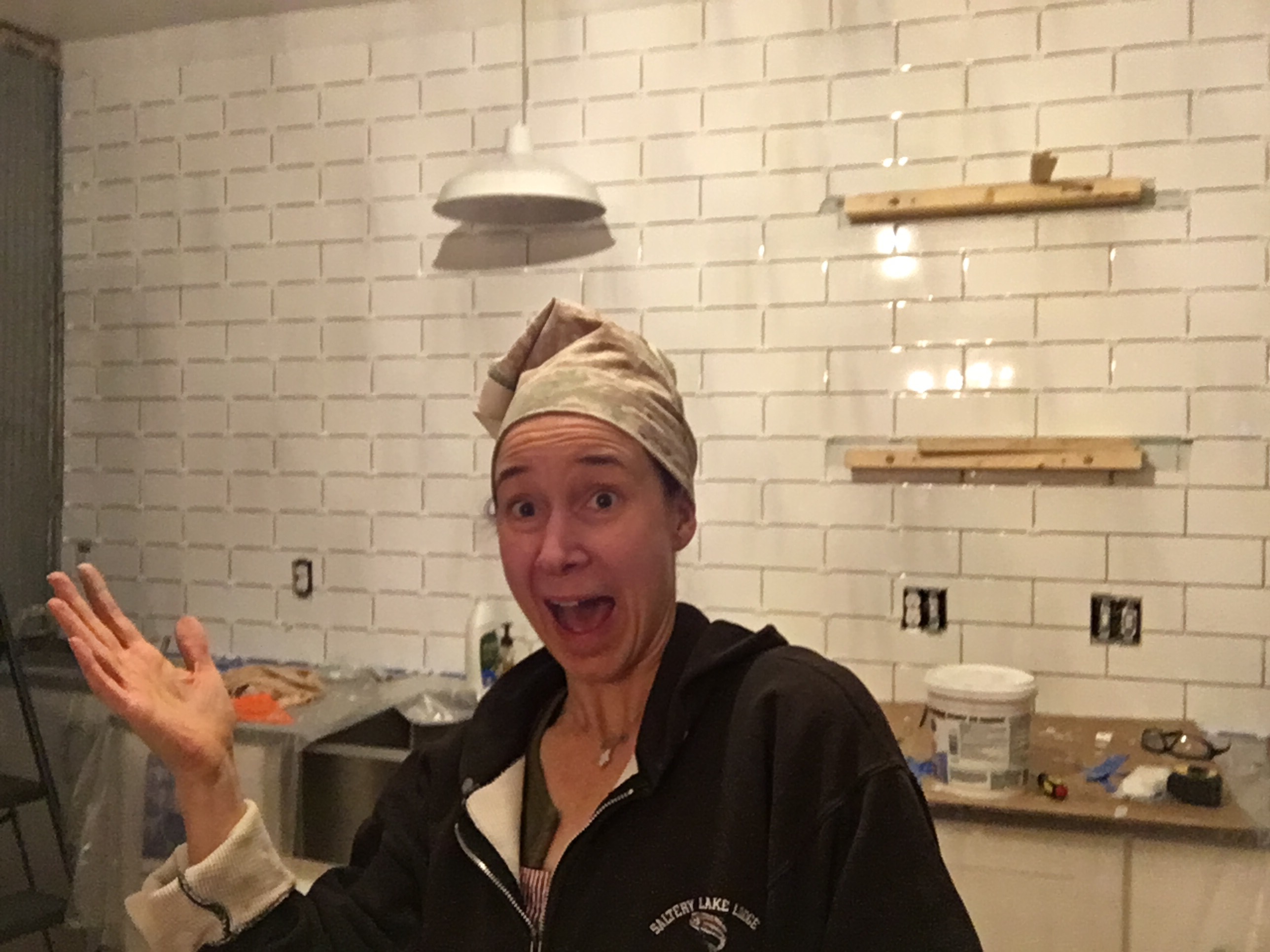 Ben ventured out to the closest hardware store (30 minute round-trip) to get more grout while I stayed at home and fumed and cleaned random drips and finger prints of mastic off the tiles. Lucky us, they had pre-mixed grout. Ben texted me…”What do you think of Delorean Gray?” I responded, “What color is that?” He said, “Gray.” Sigh. “Almost black? Almost white? Somewhere in the middle?” He said, “Middle.” I said, “Close to the countertop color?” Somehow, (he doesn’t use emojis) he texted me a shrug and an eye roll. “Do it,” I said. I’m so over it.