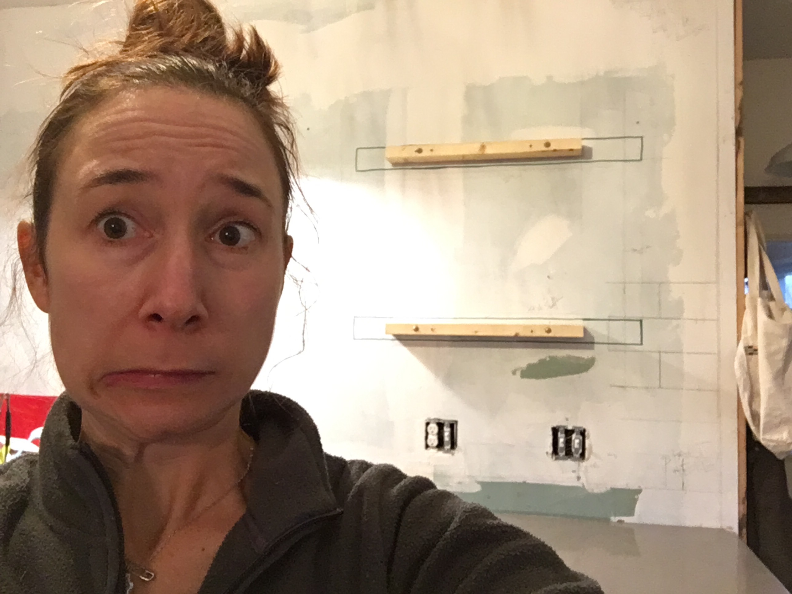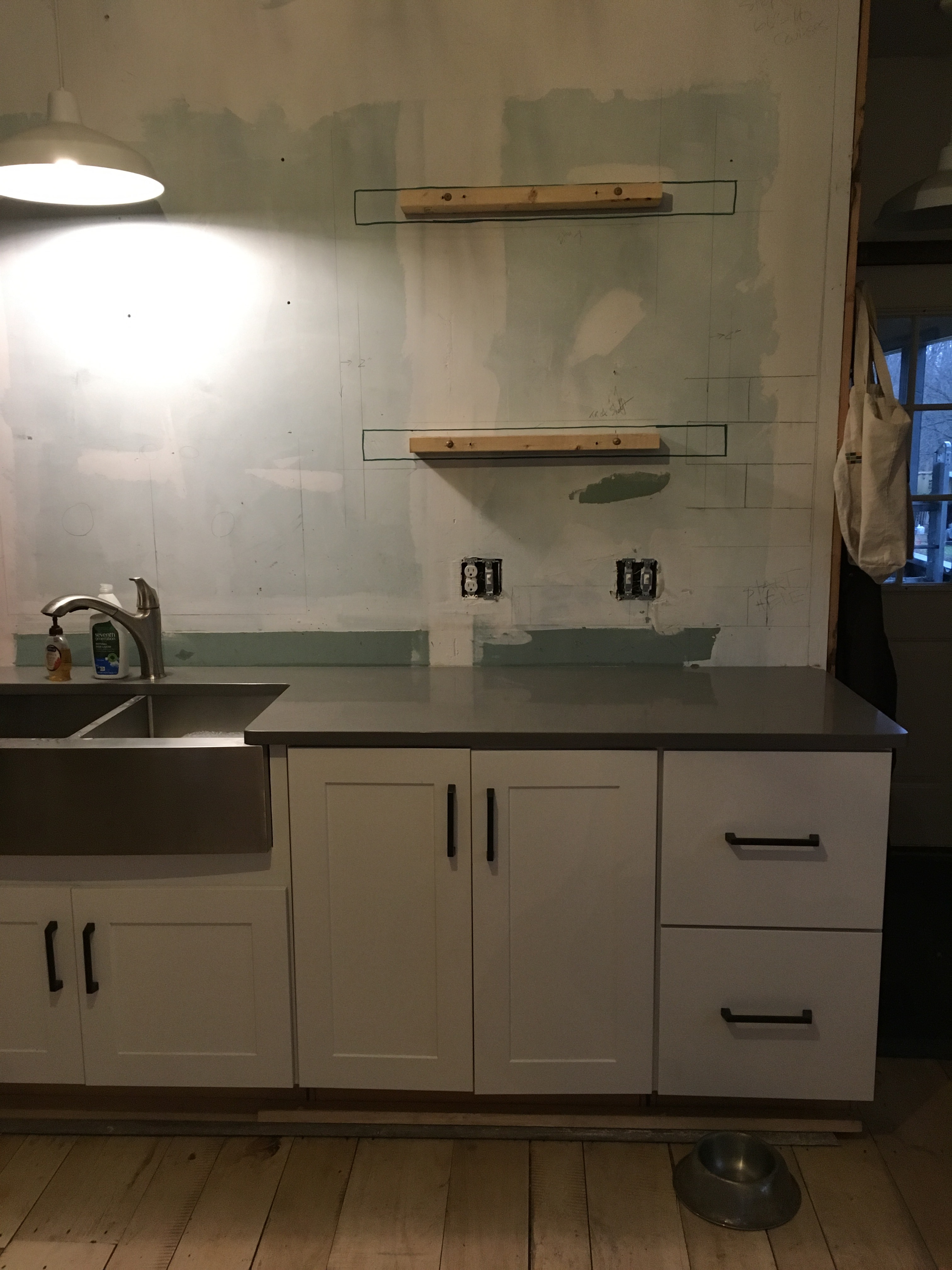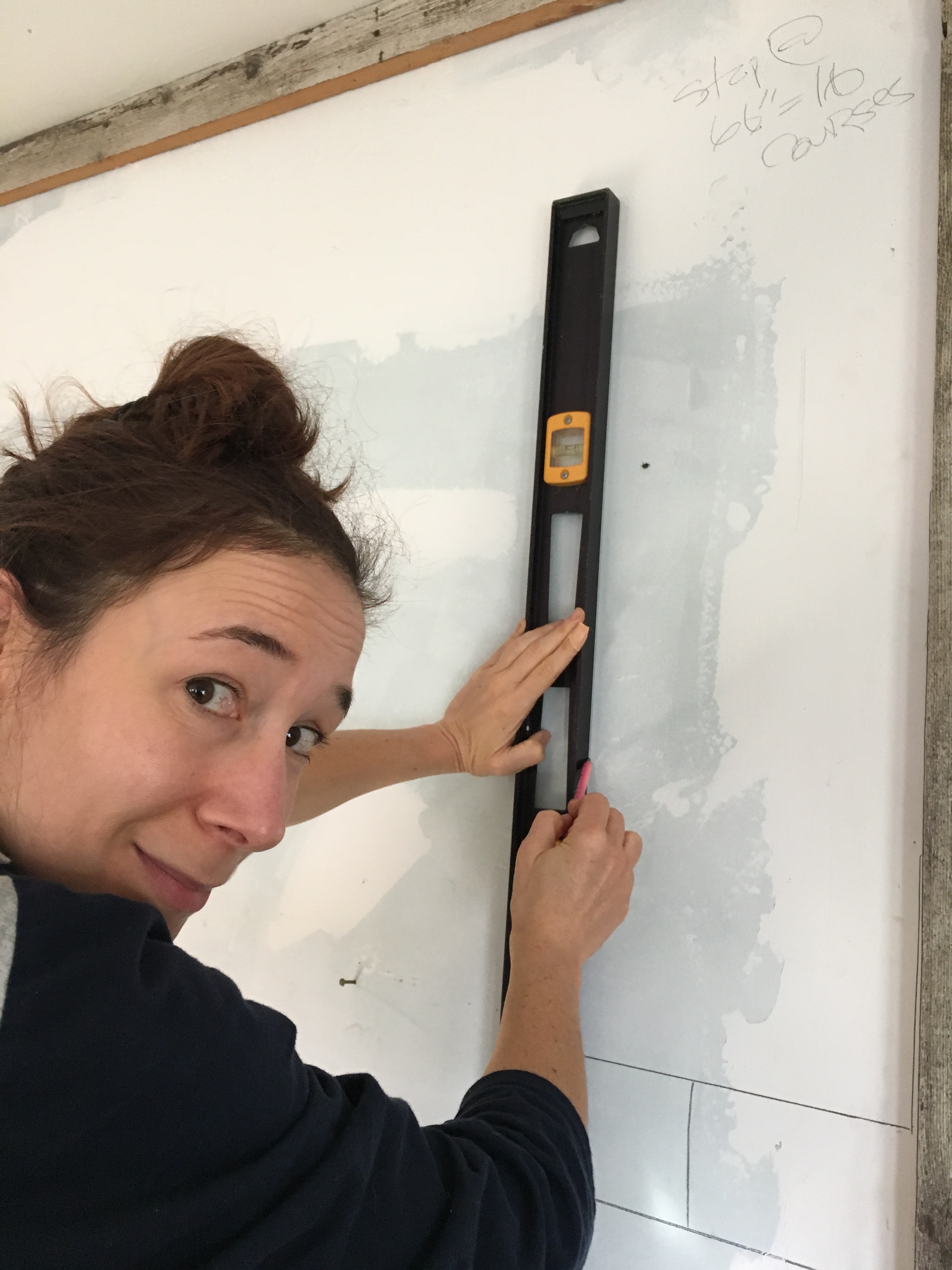 We also decided to go ahead and plan out the barnwood floating shelves that Ben will build and install. Rather than trying to drill through tiles later (and potentially breaking tiles and needing to dig them out and replace them), he installed the anchor boards on the wall so that I could tile around them. The anchors are smaller—both shorter and more narrow—than the shelves will be. The shelves will be boxes with an open backside that slips over and screws to these boards that are anchored into the wall’s studs. Sort of like putting a your hand (the anchor boards) in a mitten (the shelves). Make sense?