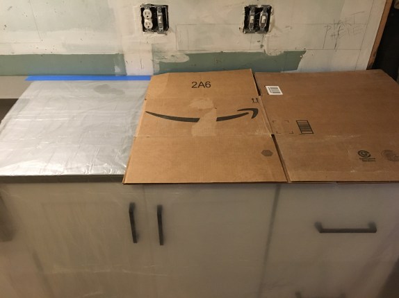 He came home with these two buckets of Delorean Gray and guess what? It is exactly the color of the countertops. SCORE!