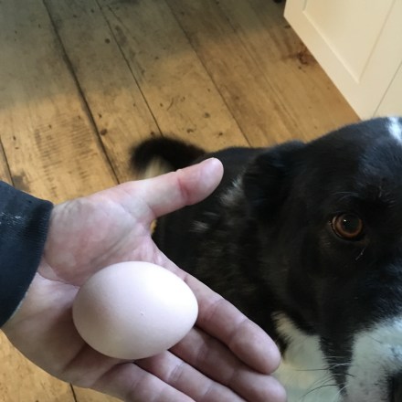 Jake’s one-eyed-selfie with one of our chicken’s gi-nor-mous eggs. I say “Yowza, that’s gotta hurt!” Jake doesn’t look impressed.
