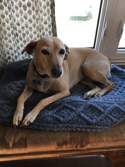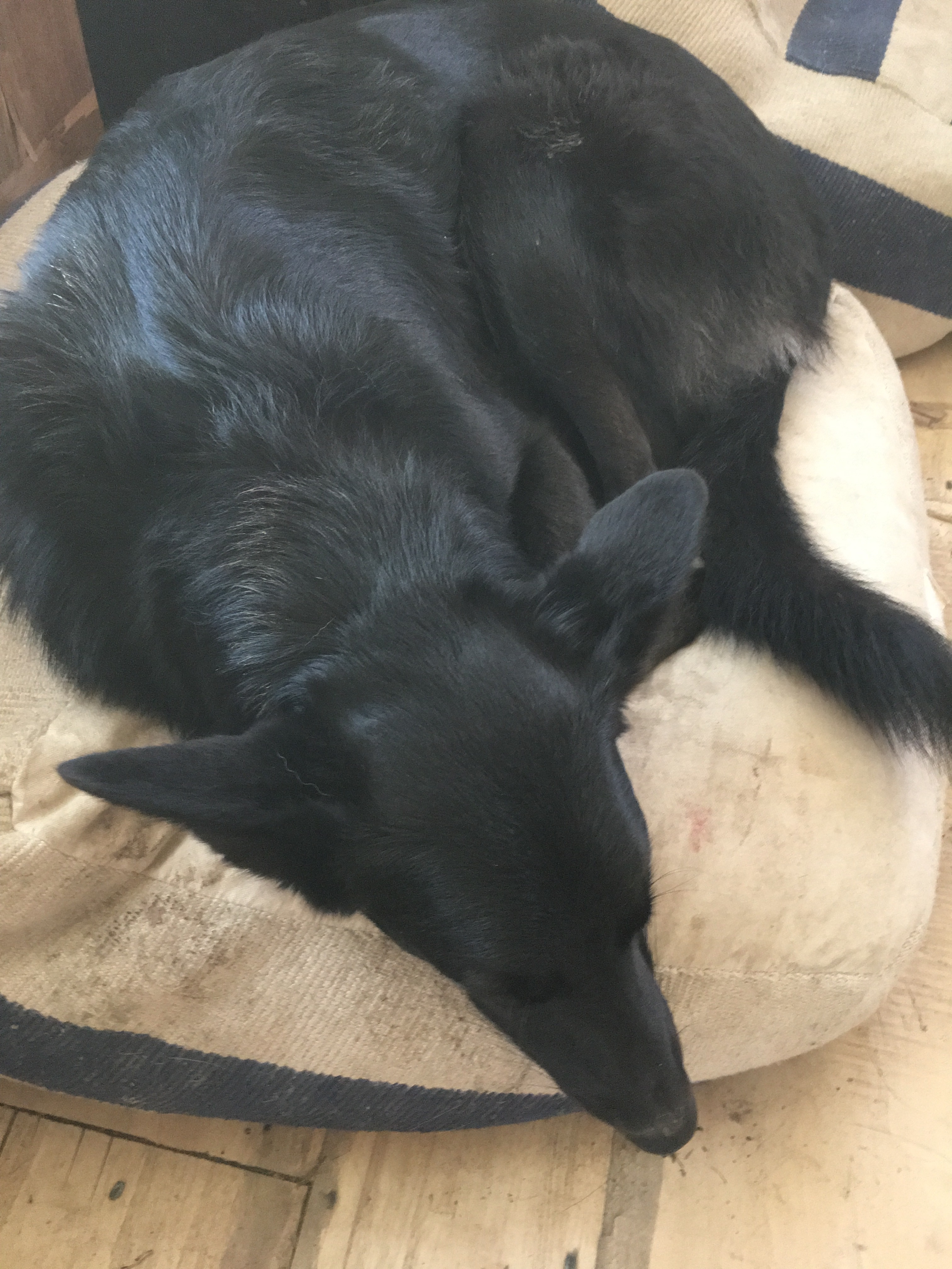 This, above, is pretty much the nightly scene…Milly takes the double stack of giant dog beds all to herself. Fletcher lays in the floor with his giant head on any real estate the old lady will allow. And Okra curls up on one of the square poufs (she’s perfected quite the balancing act!).