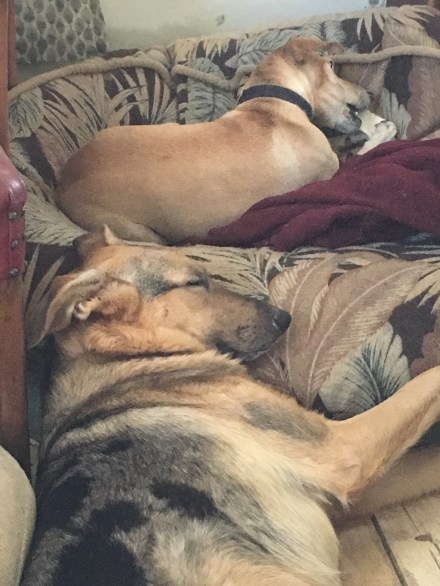 The puppies, about 18 months old, play dress up…and are generally goofy when not sleeping. Okra, above left, is the brains of this operation. She survived an horrific car accident in January of this year and has healed remarkably well! She has yet to learn that she doesn’t need to put her feet on you just because you put your hand on her…she loves to pet you back. She also loves to out-run and out-wit her brother.