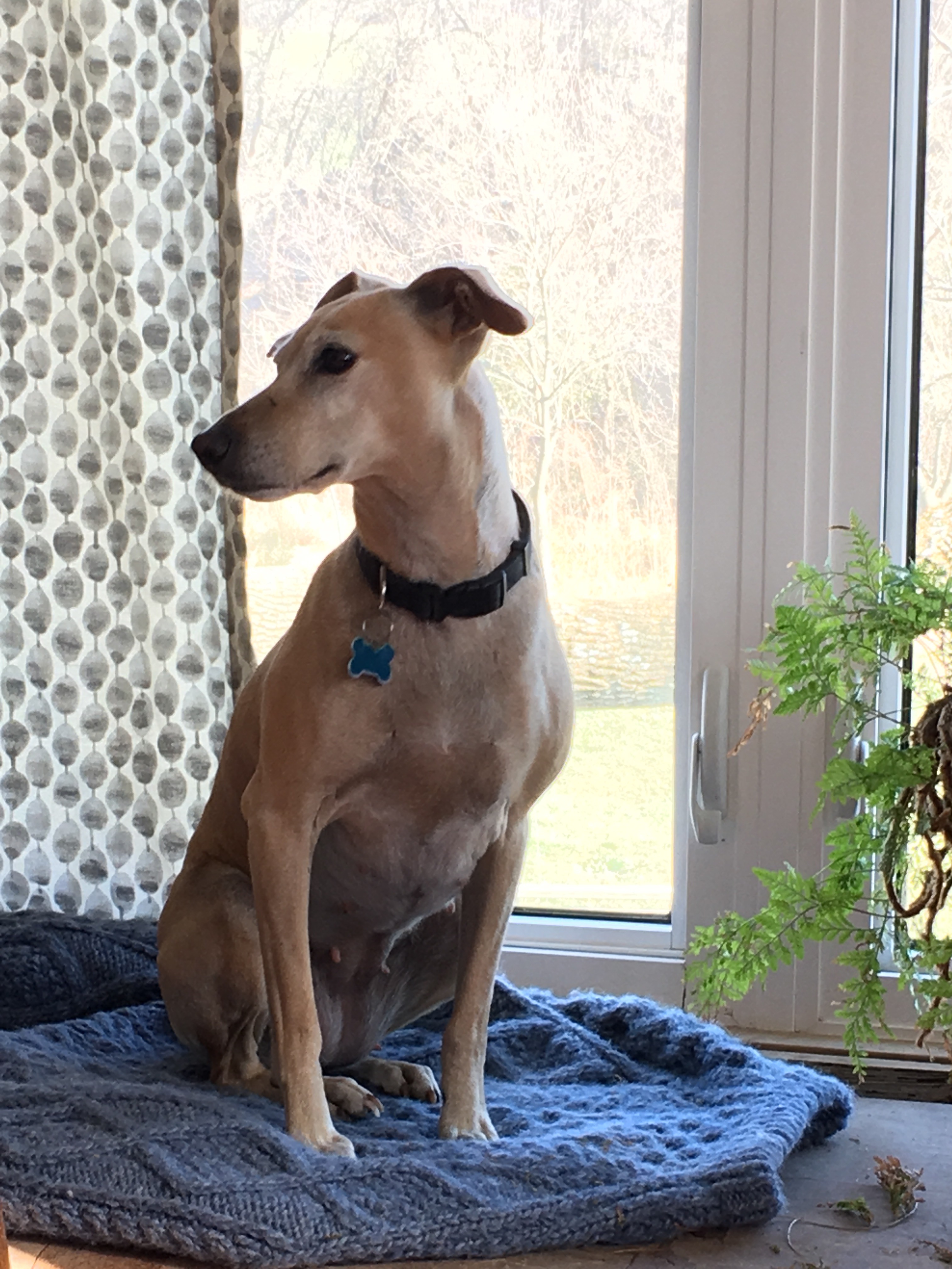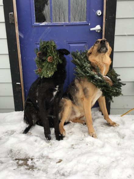 The elders face off…and usually share this look with each other when the puppies are acting a fool (which is often). Milly, above left, is almost 7 years old, dances and does intricate figure-eight circles when she thinks you are reaching for the treats jar, is taking her role as “old lady of the house” very seriously, and needs a winter coat but refuses to wear one so she cuddles up next to the wood stove, lounges in the sun, and shivers and chatters audibly.