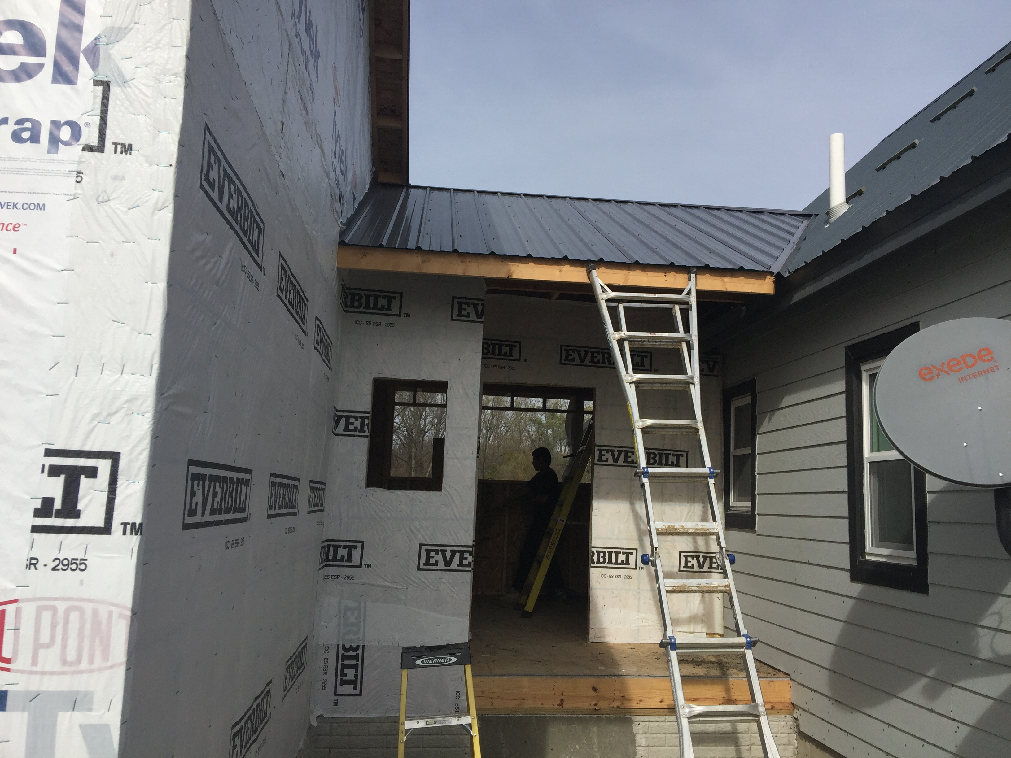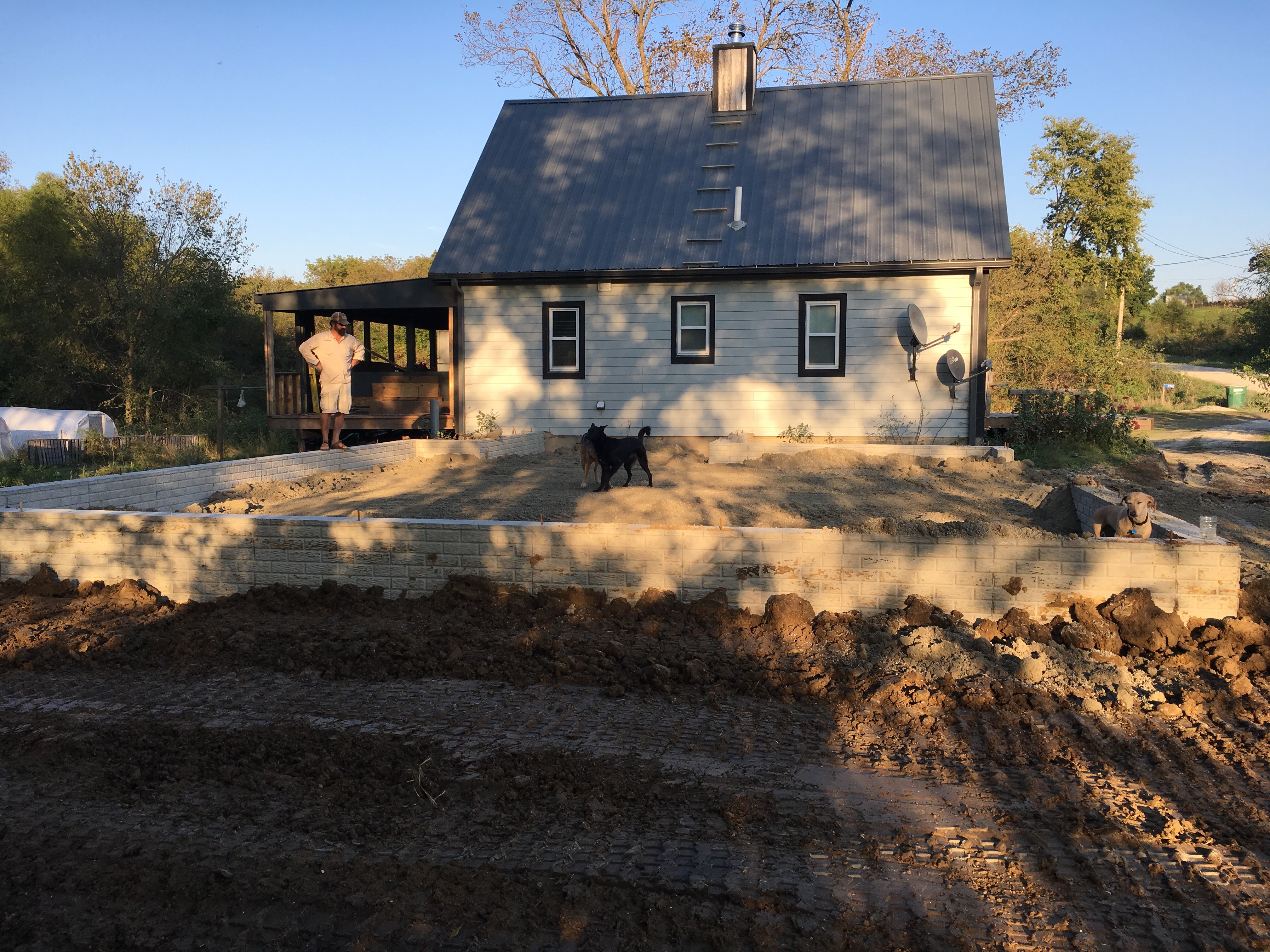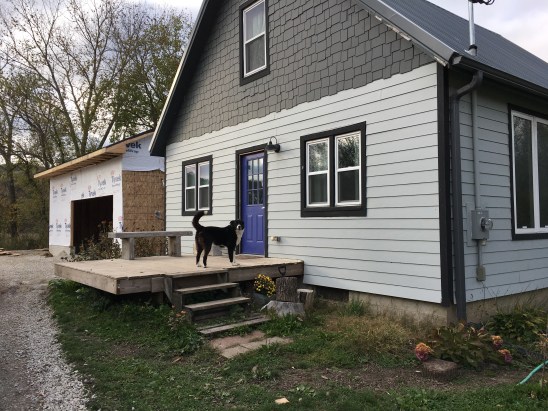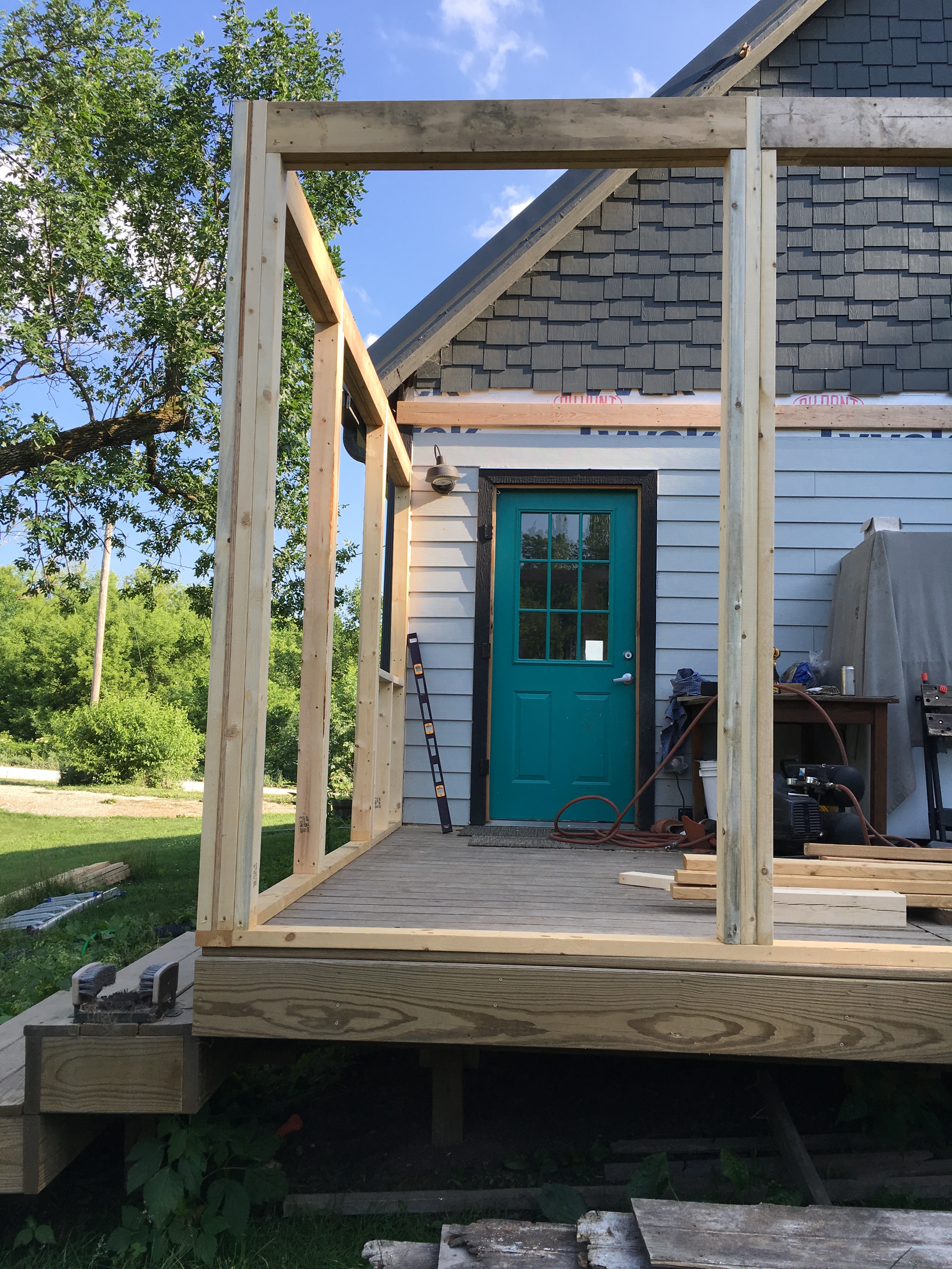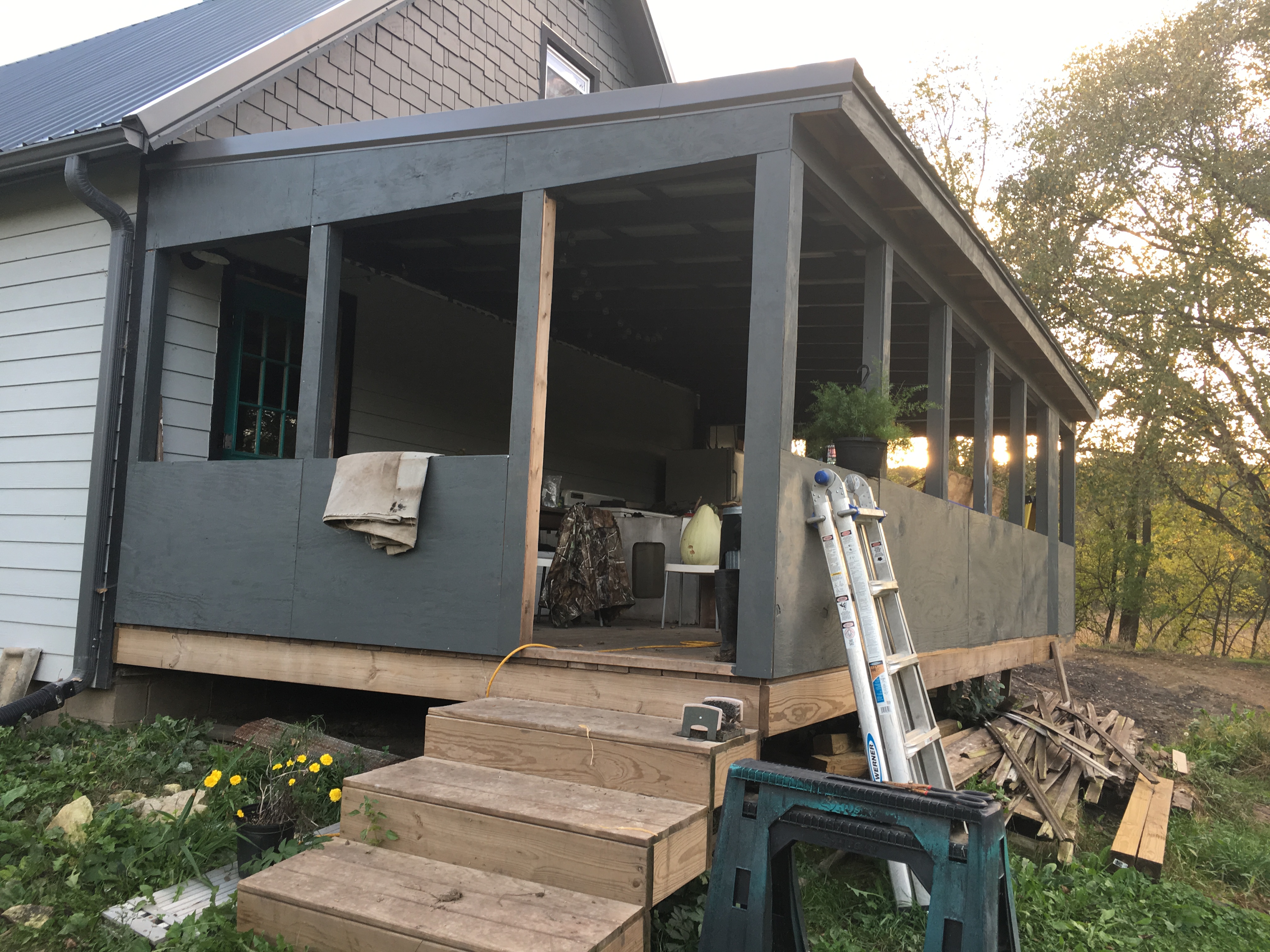 When we re-sided the house during the summer of 2014, Ben built a 12-foot-wide deck to span the entire 30-feet-long back of the house. This summer, he took that one step farther by building framing and half-walls and covering with extra steel roofing panels (leftovers from our roofing job, also in summer 2014). So now we have an open-air, covered porch (read about it here). And, in the spring, we’ll screens the openings to create a screen porch with living and dining space. Oh spring…how I long for thee!