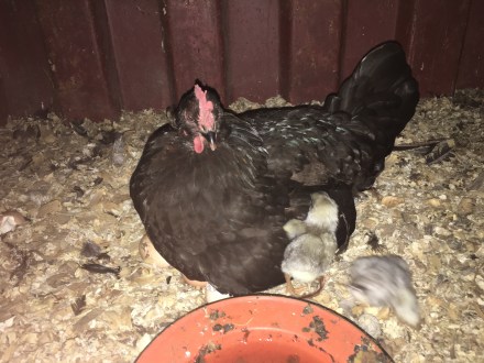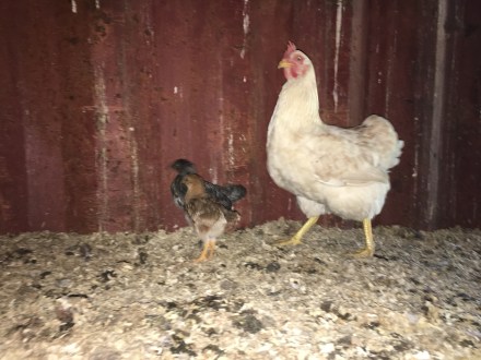 Soon after, another hen went broody and was nesting at the other end of the coop. She, too, was stealing eggs, but we were smart this time (Thanks, Grandma, for the tip!) and were able to keep her stash down to about 10. She hatched the two silver chicks you see below.